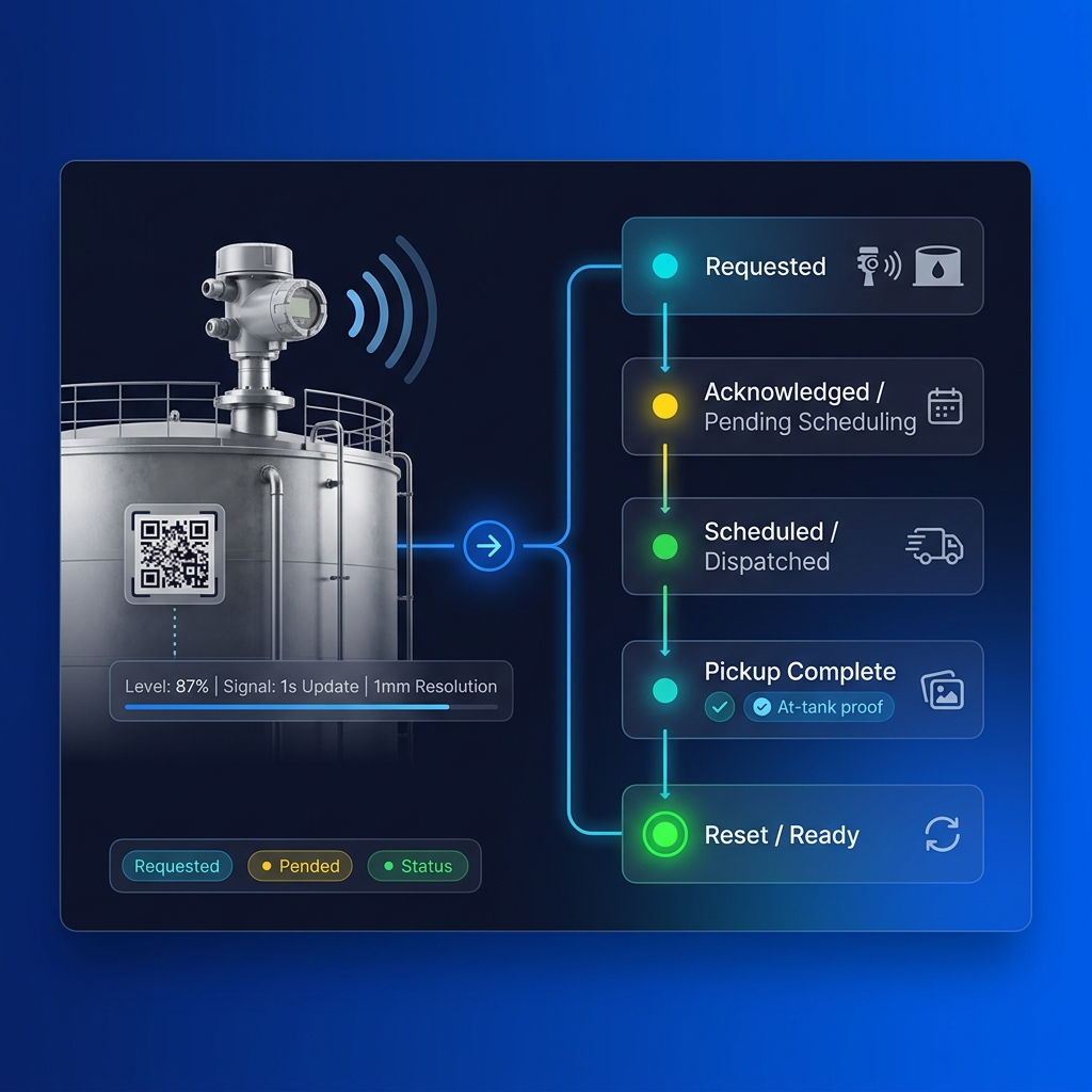 AFMS combines tank monitoring, control, pickup coordination, and proof of closeout in one shared operating flow — from tank signal to request, dispatch, field execution, closeout, and reset.