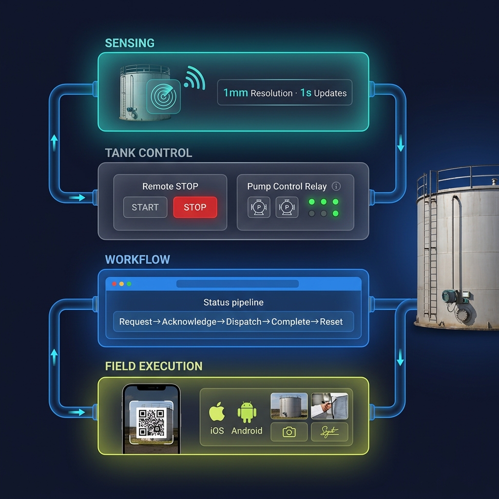 AFMS connects sensing, Tank Control, portal workflow, and QR-first field execution so sites can move from tank visibility to controlled action, pickup proof, and clean reset in one partner-installed system.