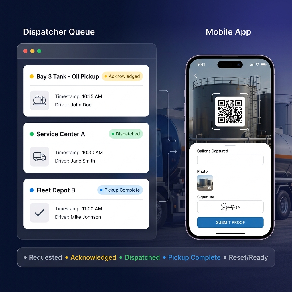 AFMS gives tank owners, vendor dispatchers, drivers, and back-office teams one shared workflow from request creation through scheduling, dispatch, at-tank proof, invoice or credit closeout, and reset.